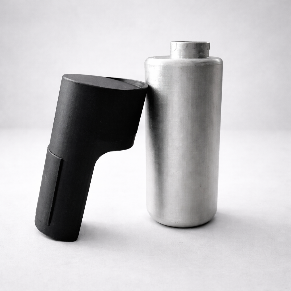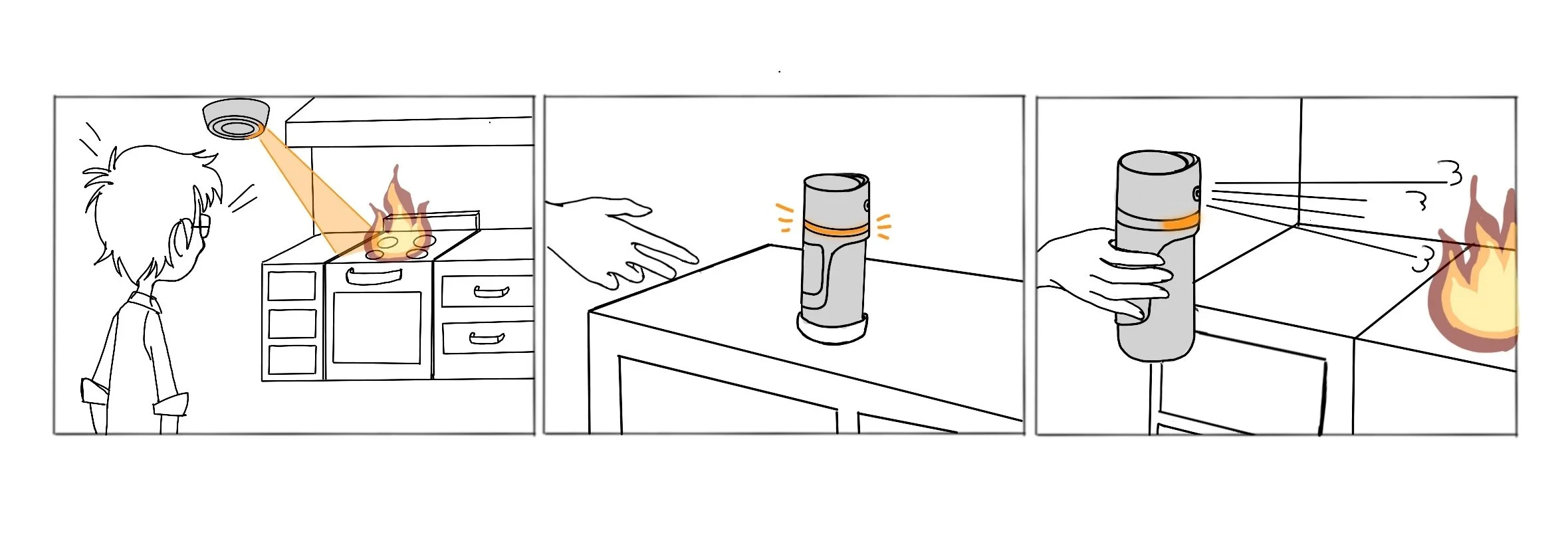 A compact, easily replaceable suppressant canister, a heat sensor that triggers suppressant release, and an alarm system that notifies all household members. To simplify and speed up emergency response, ensuring that even under stress, users can act quickly and effectively to contain a fire and alert others.