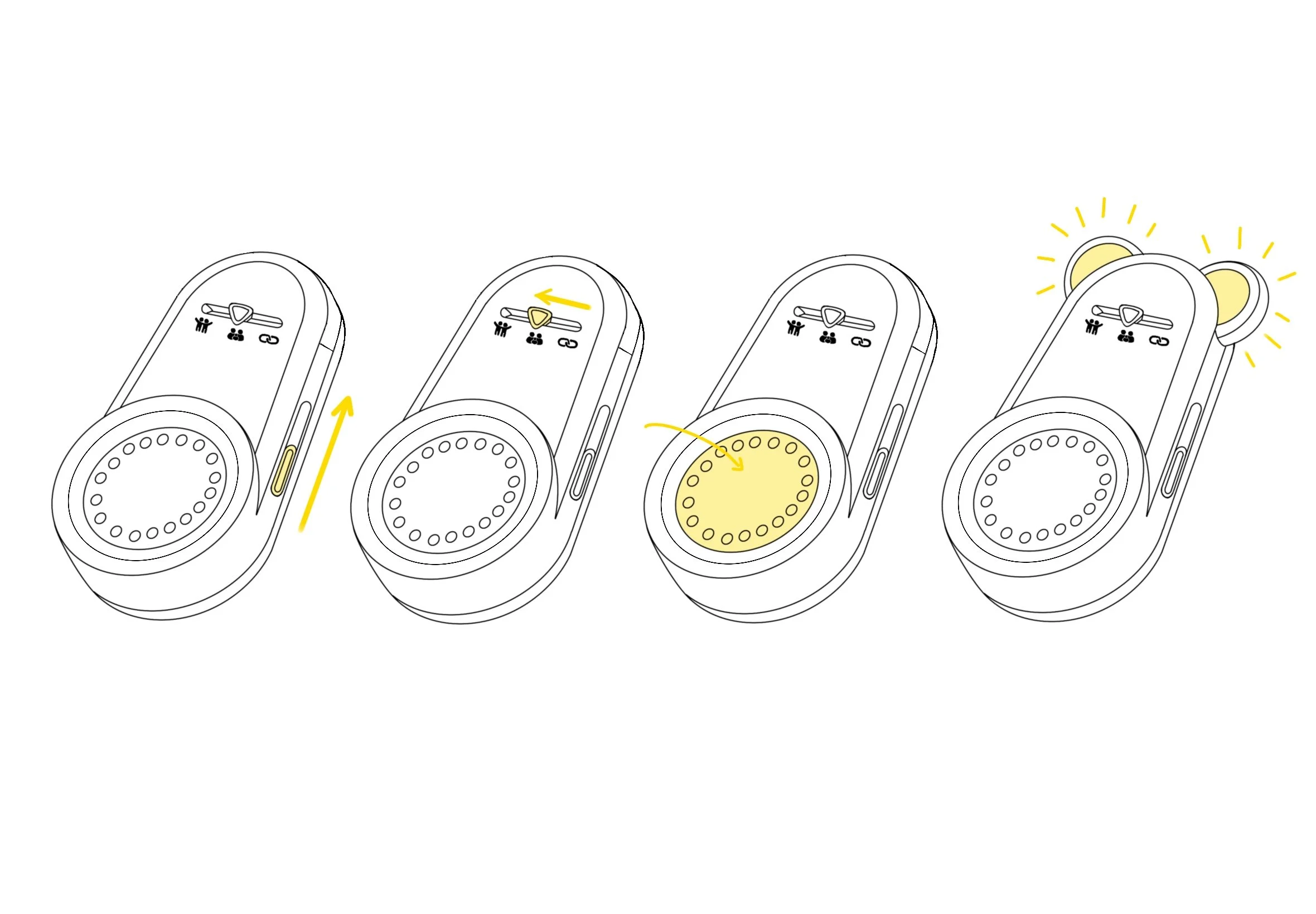 Users slide to turn it on, choose who to connect with, then press the speaker button to talk—ears pop out to show it’s ready.